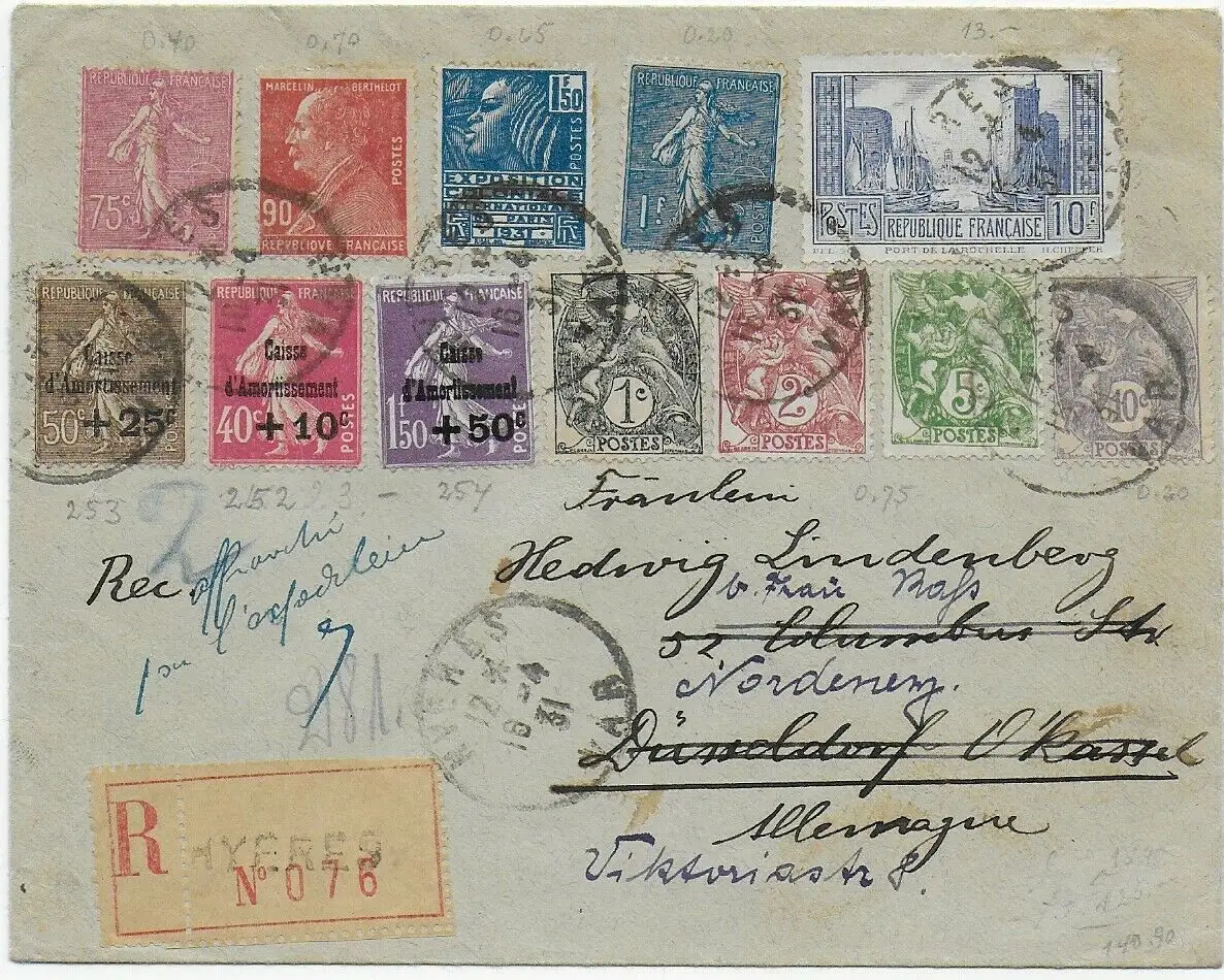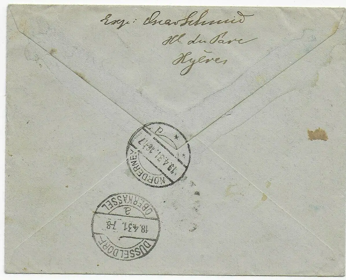 Einschreiben Hyeres nach Düsseldorf, weiter Nordeney, 1931, MiNr. 252-254
