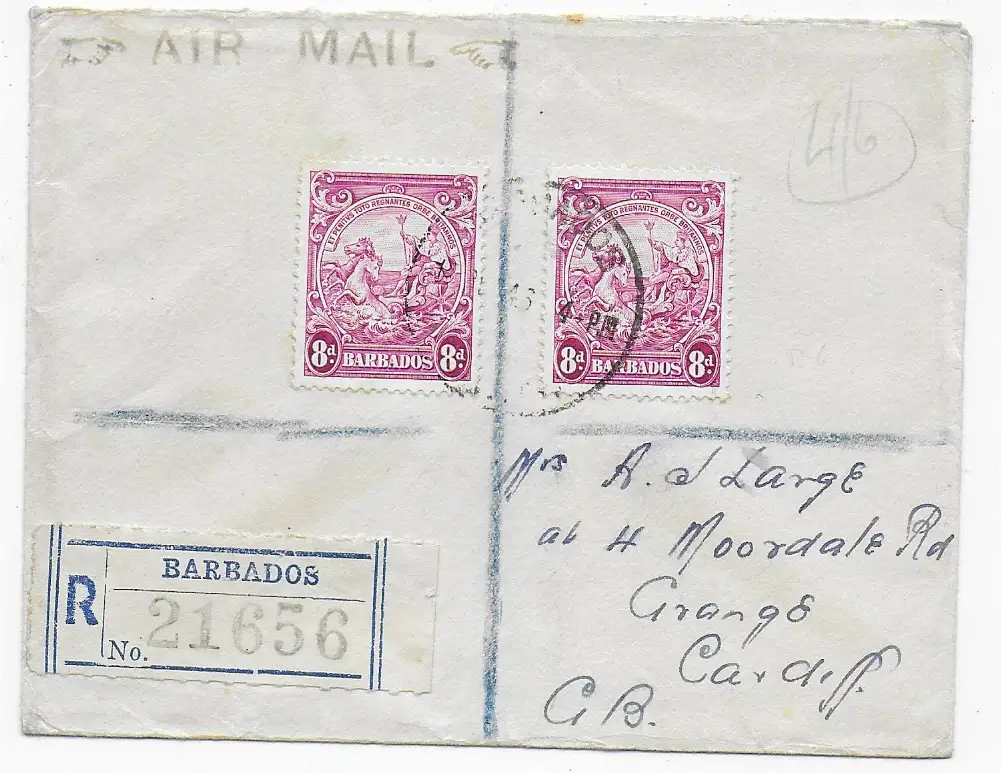 Einschreiben Luftpost Barbados nach Cardiff 1946