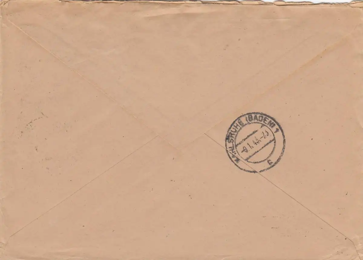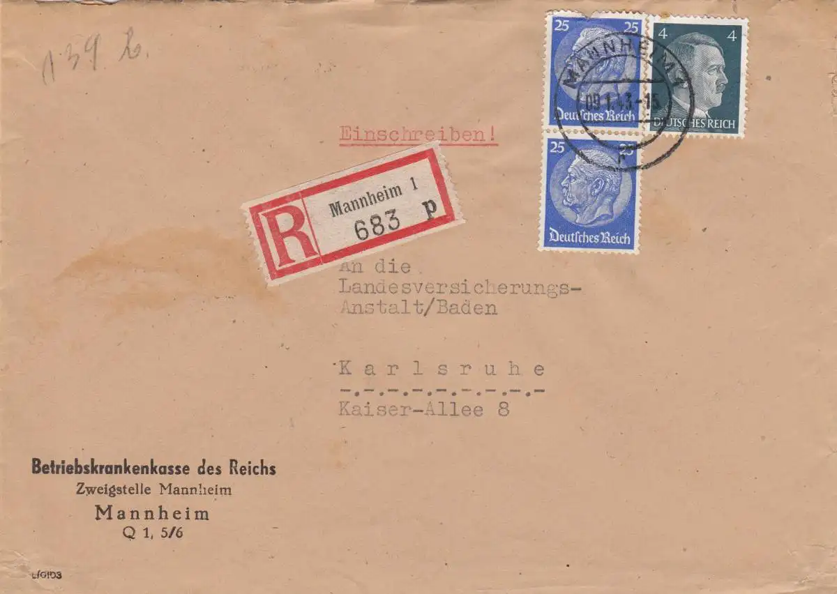 Einschreiben Mannheim, BKK nach Karlsruhe 1943
