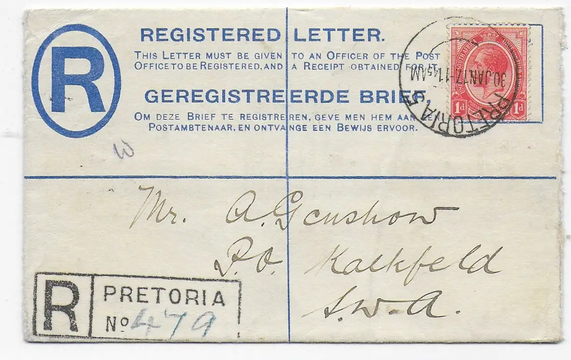 Einschreiben Pretoria nach Kalkfeld, 1917