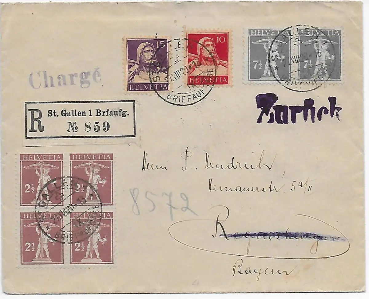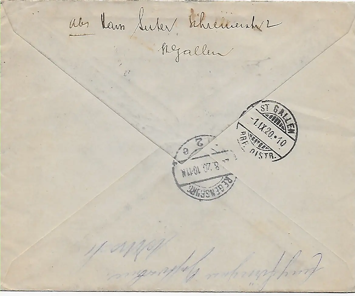 Einschreiben St. Gallen 1 Briefaufgabe, 1920 nach Regensburg und zurück