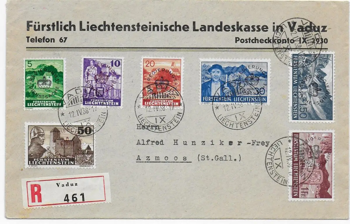 Einschreiben Vaduz 1938 nach Azmoos/St. Gallen, Fürstliche Landeskasse