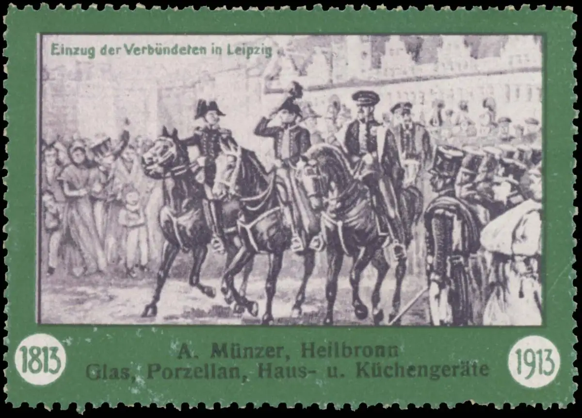 Völkerschlacht, Befreiungskriege, Glas, Porzellan, Haus- und Küchengeräte, Größe/Zustand: 5x7 , guter Zustand, Original alte Reklamemarke die seinerzeit für die Werbung benutzt wurde