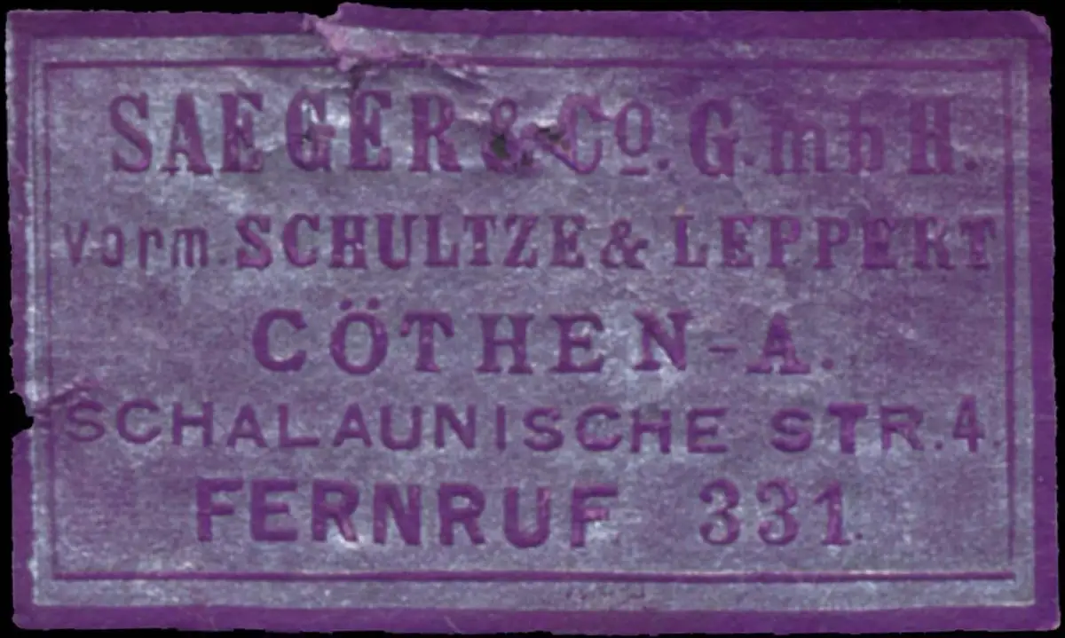 vormals Schultze & Leppert, Berlin, Cöthen-Anhalt, Schalaunische Straße 4, Größe/Zustand: 2x4 , beschädigt, Original alte Reklamemarke die seinerzeit für die Werbung benutzt wurde