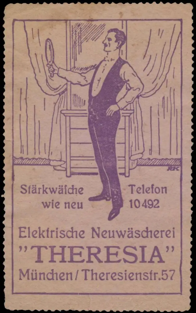 Wäscherei, Theresienstraße 57, Größe/Zustand: 8x5 , fleckig, Original alte Reklamemarke die seinerzeit für die Werbung benutzt wurde