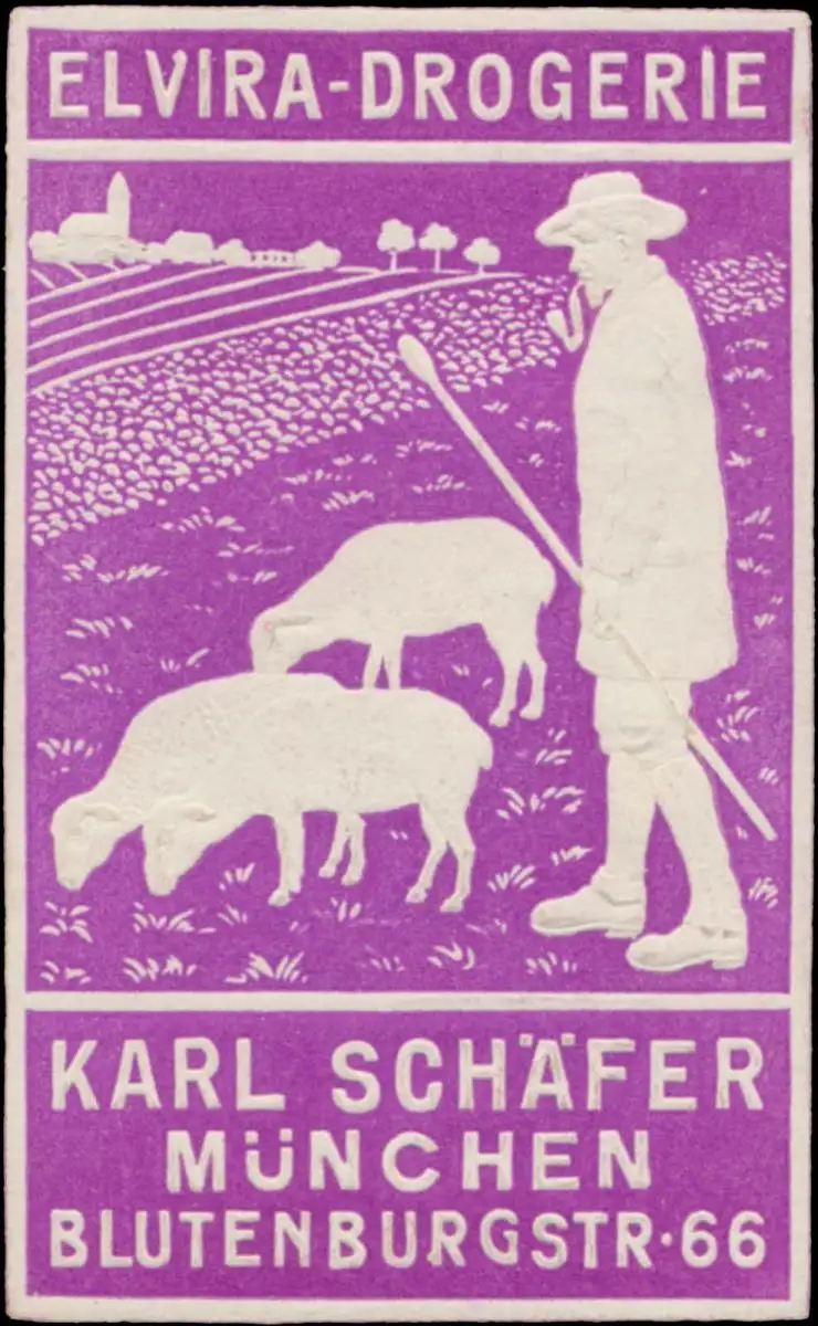 Schäfer mit Schafe, Blutenburgstraße 66, violett, Größe/Zustand: 6x4 , guter Zustand, Original alte Reklamemarke die seinerzeit für die Werbung benutzt wurde