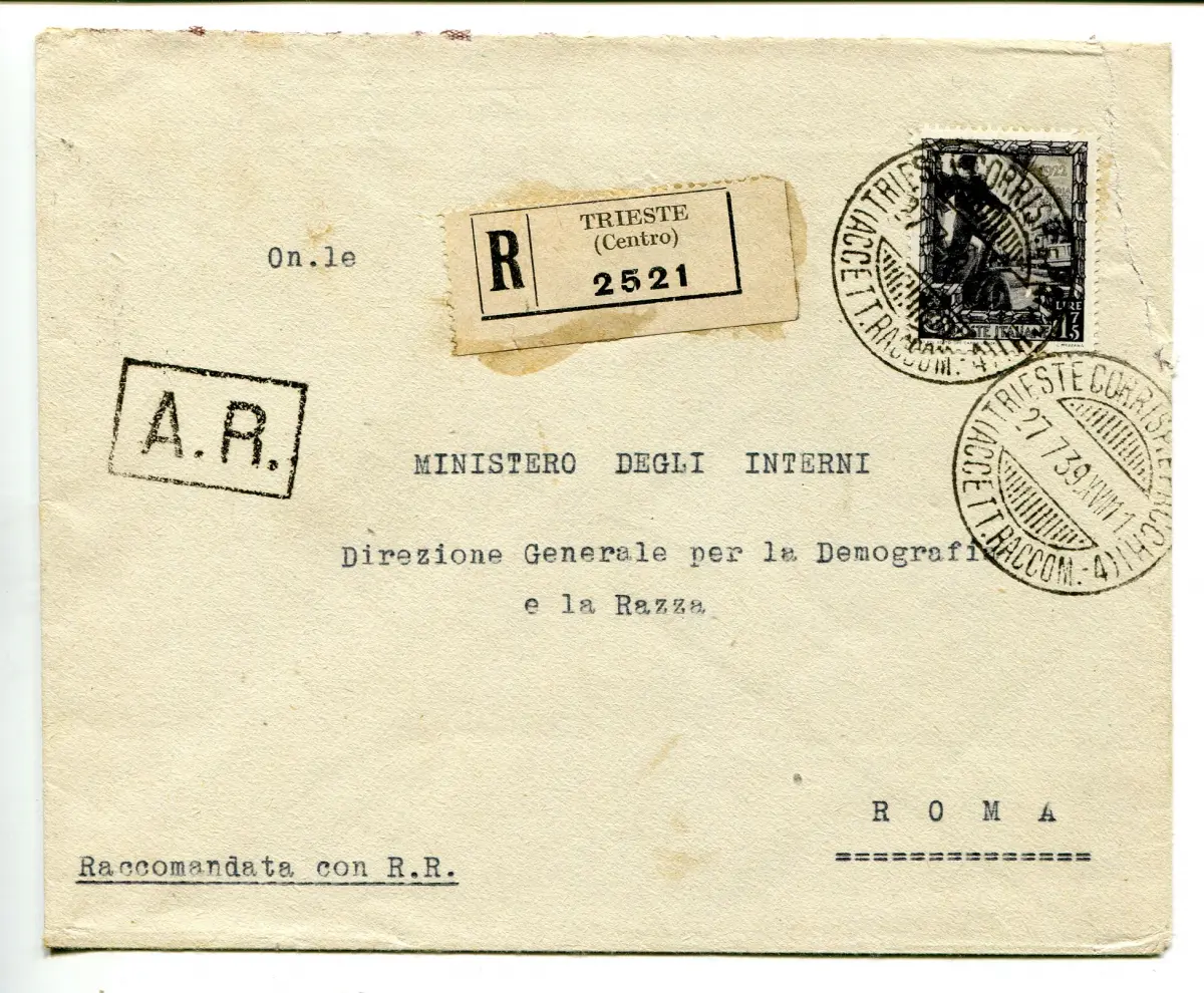 Empire Lire 1,75 isoliert auf Umschlag Empire Lire 1,75 Nr. 447 isoliert auf Einschreiben von Trietse nach Rom am 27.7.39 - Kat. euro 60 Cod. 253/A