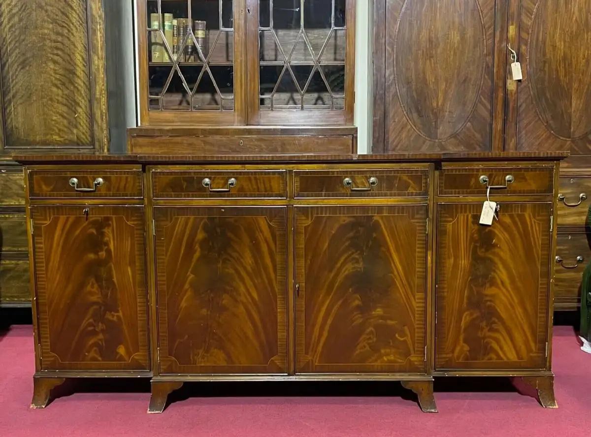 Regency Sideboard Anrichte Breakfront Zustand - Wird nach Verkauf restauriertSichtholz Mahagoni Schubfächer sind zusammengestecktTüren sind abschließbarRegalboden sind verstellbarFront hat eingesetzte IntarsieVersandkostenfrei innerhalb Deutschland Breite 194 cm / Höhe 92 cm / Tiefe 46 cm Für eine Beratung oder Rückfragen stehen wir Ihnen jederzeit zur Verfügung.