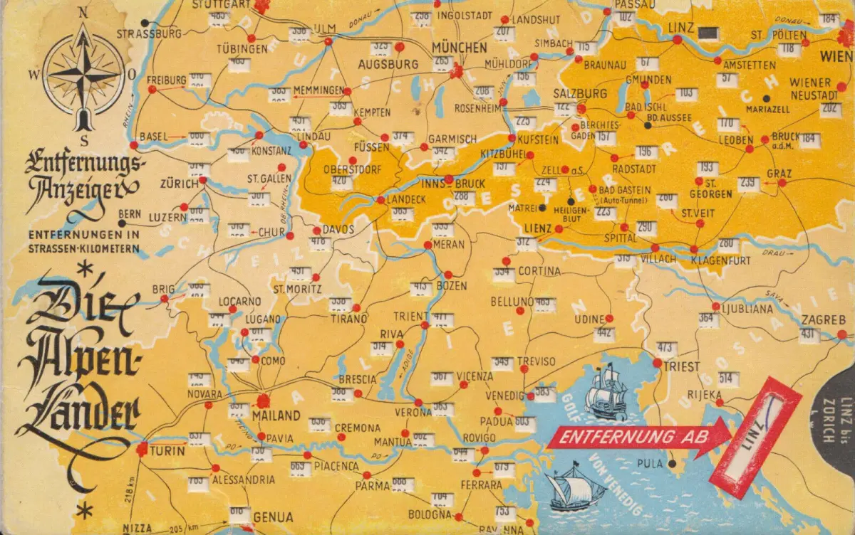 Entfernungsanzeiger Die Alpenländer Erscheinungsjahr: ohne Jahresangabe, um 1960 Format: 10 x 16 cm Versandgewicht: 30 g Der