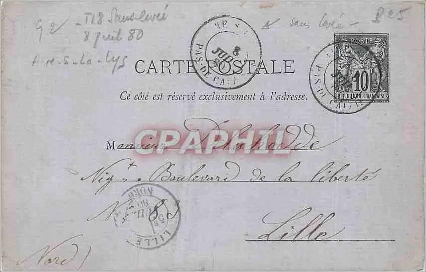 Entier Postal 10c Sage Delahodde Lille cachet sans levee 1880 Aire sur Lys Rare