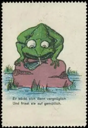 und frisst sie auf gemütlich. Frosch, Größe/Zustand: 7x4 , leicht beschädigt, Original alte Reklamemarke die seinerzeit für die Werbung benutzt wurde