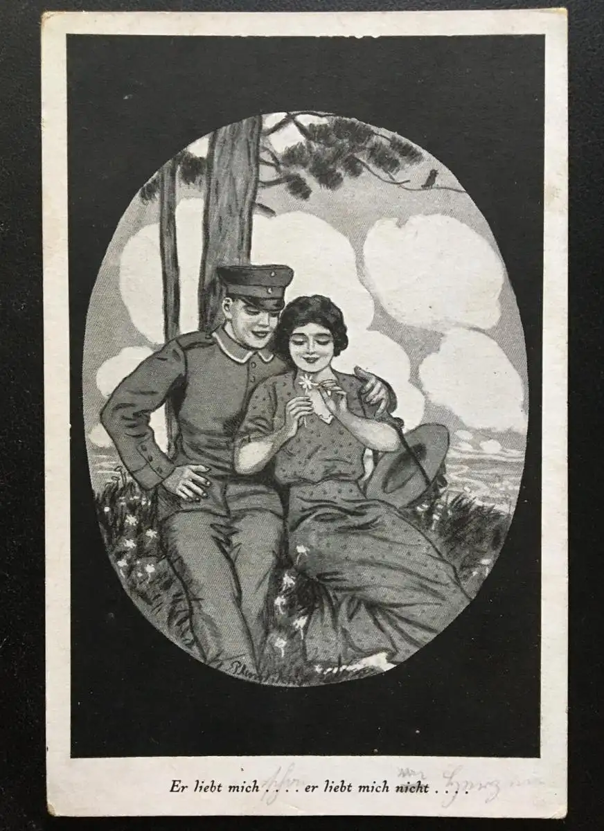 Er liebt mich/nicht - Soldat mit Frau Blume - Militär Krieg 400641 TH