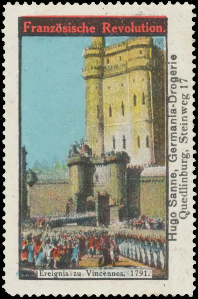 Französische Revolution, Germania-Drogerie, Steinweg 17, Inhaber: Hugo Sanne, Größe/Zustand: 6x4 , guter Zustand, Original alte Reklamemarke die seinerzeit für die Werbung benutzt wurde
