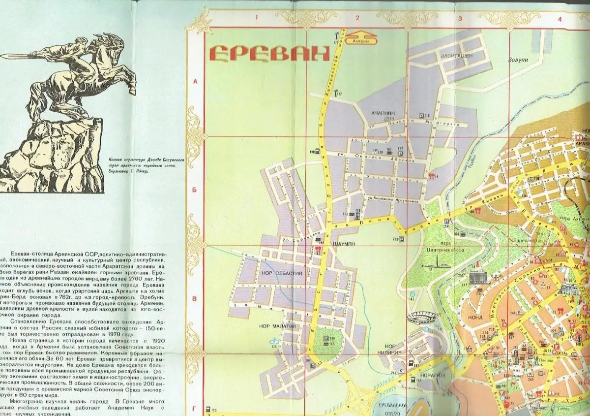 guter Zustand, geringe Gebrauchs- und Alterungsspuren: teils etwas knittrig und eselsohrig - wenige kleine Einrisse - teils kleine Randblessuren - Außenfalz und -kanten beschabt, Stadtplan von Jerewan mit zahlreichen Informationen, Papier, ca. 11,5 x 25 (aufgeklappt ca. 68 x 50), 24 Seiten