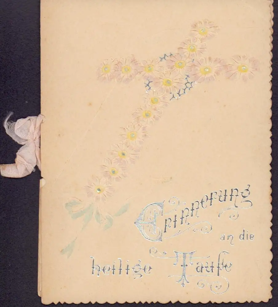 Seitenanzahl: 2 Bll. mit 1 Illustr. zwischen Feinkarton-Deckeln mit gestanzten Rändern. VDeckel-Text in Silberprägung unter einem von Blüten gebildeten erhaben geprägtem Kreuz; auf der Innenseite des RDeckels 1 mont. Briefumschlag (ca. 6 x 7,5 cm). 12mo (ca. 11,5 x 8,