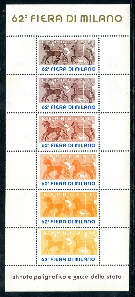 Vollgummi - Erinnerungsbogen, der der 62^ Fiera di Milano gewidmet ist, reproduziert die Skizze von 1965, die für eine nie ausgegebene Expressmarke Nr. 21/WEB