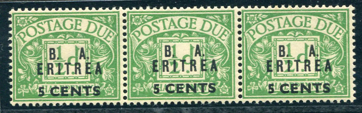 Eritrea Occ. Englisch - ST B. M. A. 5 Cent. auf 1/2 S. Sorte Vollgummi MNH - Eritrea Occ. Englisch - Steuermarken B. M. A. 5 Cent. auf 1/2 S. Nr. 6 Dreierstreifen mit nicht ausgerichteten Aufdrucken - weiter unten auf dem ersten Exemplar - Selten, für Fachmann Cod. 976/15