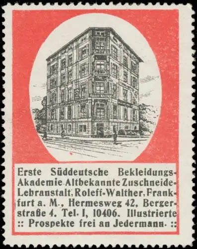 Altbekannte Zuschneide-Lehranstalt, Hermesweg 42, Bergerstraße 4, Größe/Zustand: 6x5 , guter Zustand, Original alte Reklamemarke die seinerzeit für die Werbung benutzt wurde