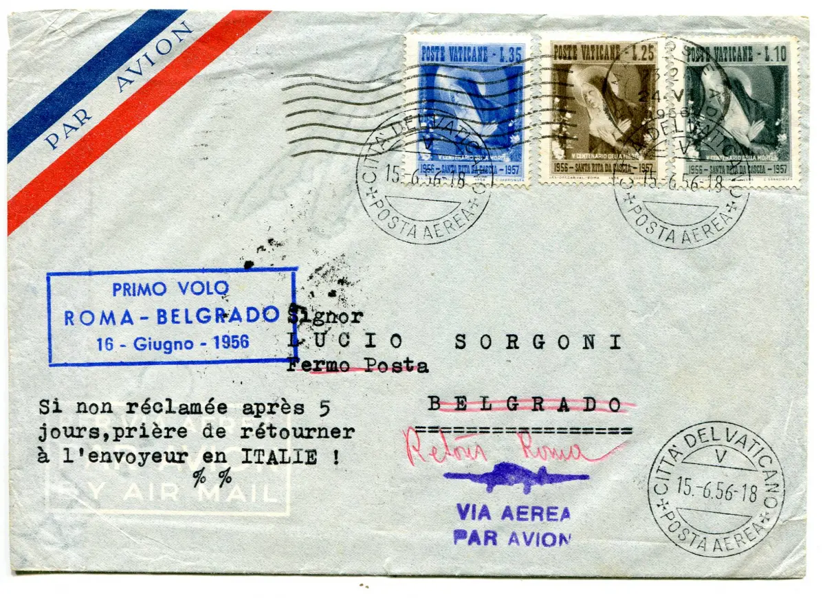 Erstflug JAT (Vatikan)/Rom/Belgrad vom 16.6.56 - Aerogramm nach Belgrad mit Ann. Flugspezial (Kat. Pellegrini Nr. 243MM) - Seltene Nr. 1350/A