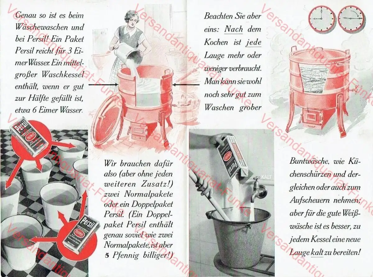 sehr guter Zustand, geringe Gebrauchs- und Alterungsspuren: Rückseite an der unteren Ecke leicht beschädigt, Persil / Henkel-Prospekt, Werbung für Waschlauge zur Datierung: war eine Zeitschriftenbeilage des Jahres 1933, Papier, ca. 16 x 24, 4 Seiten mit einigen Bildern