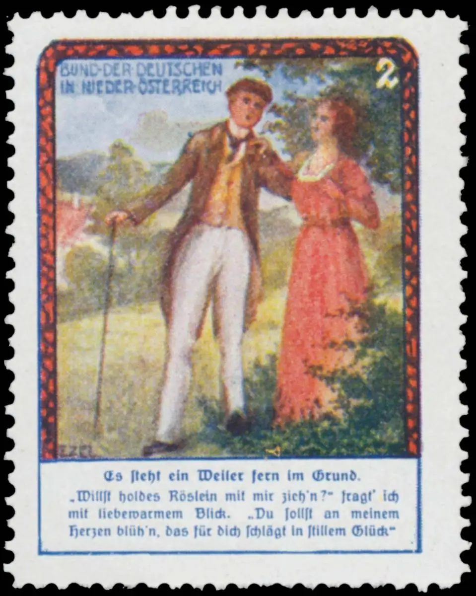 Willst holdes Röslein mit mir zieh'n? Fragt ich mit liebewarmen Blick. Du sollst an meinem Herzen blühn, daß für dich schlägt in stillem Glück., Größe/Zustand: 5x4 , guter Zustand, Original alte Reklamemarke die seinerzeit für die Werbung benutzt wurde