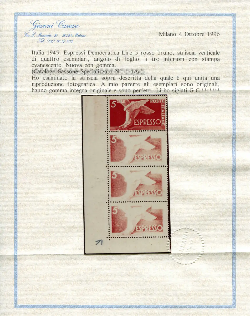 Espressi Lire 5 Sorten unvollständiger Druck Vollgummi - Espressi Lire 5 Nr. 25b wunderschöner vertikaler Streifen von vier a. f. mit den unteren drei Exemplaren mit unvollständigem, verblassendem Druck - Schön und ungewöhnlich - Zert. Carraro - Kat. euro 1.050 n. 701/6