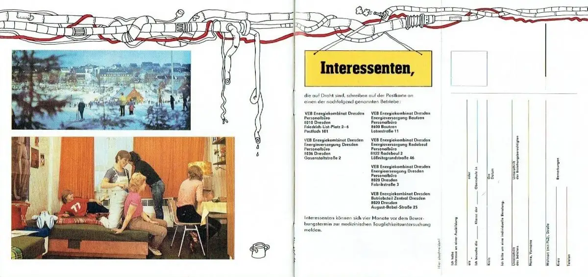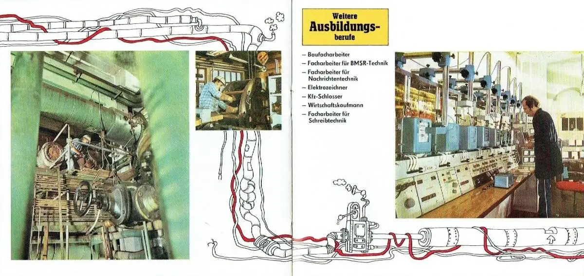 sehr guter Zustand, geringe Gebrauchs- und Alterungsspuren: Rückseite an der Unterkante teils etwas angeknickt, Werbebroschüre für die Berufswahl, vorgestellt werden: - Maschinist für Wärmekraftwerke - Elektromonteur - Gas- und Wärmenetzmonteur - Instandhaltungsmechaniker - Weitere Ausbildungsberufe - Berufsausbildung - Weiterbildung für Facharbeiter - Wir leben so, wie wir arbeiten - unbenutzte Postkarte für Interessenten, kartoniert, ca. 20 x 19, 24 Seiten mit 36 Fotos