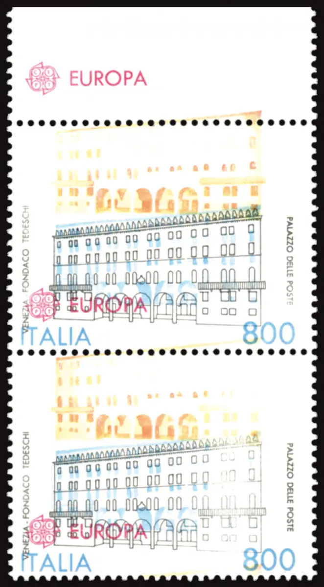 Europa 1990 Sorte EUROPA UNTEN Vollgummi MNH - Europa 1990 Lire 800 Nr. 1936 wunderschönes vertikales Paar mit stark nach oben verschobenen gelben und roten Farbdruck, so dass die Schrift und das Symbol Europa unten statt oben sind und am Blattrand wiederholt werden (Sass. spec. Nr. 1568 Aa) Cod. 685/16