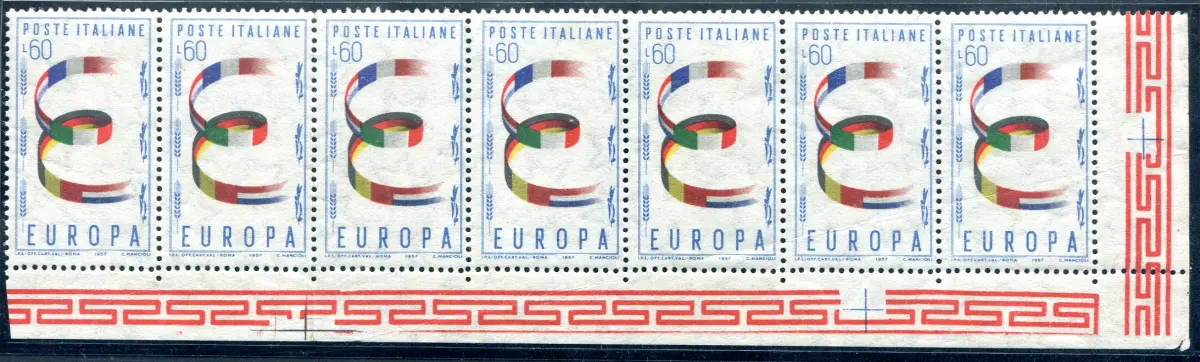 Europa '57 Lire 60 Sorten Druck hellblau als normal Vollgummi - Europa '57 Lire 60 Nr. 818 Streifen von sieben Exemplaren b. von f. mit dem Druck von blau mit einer deutlich helleren Abstufung als normal (Rahmenschriftzug und Verzierungen) - Ursprünglich war es ein Streifen von zehn, von dem eine Kopie des Cert. ED - Drei Exemplare rechts sind gefaltet - Unveröffentlichter Code 536/8