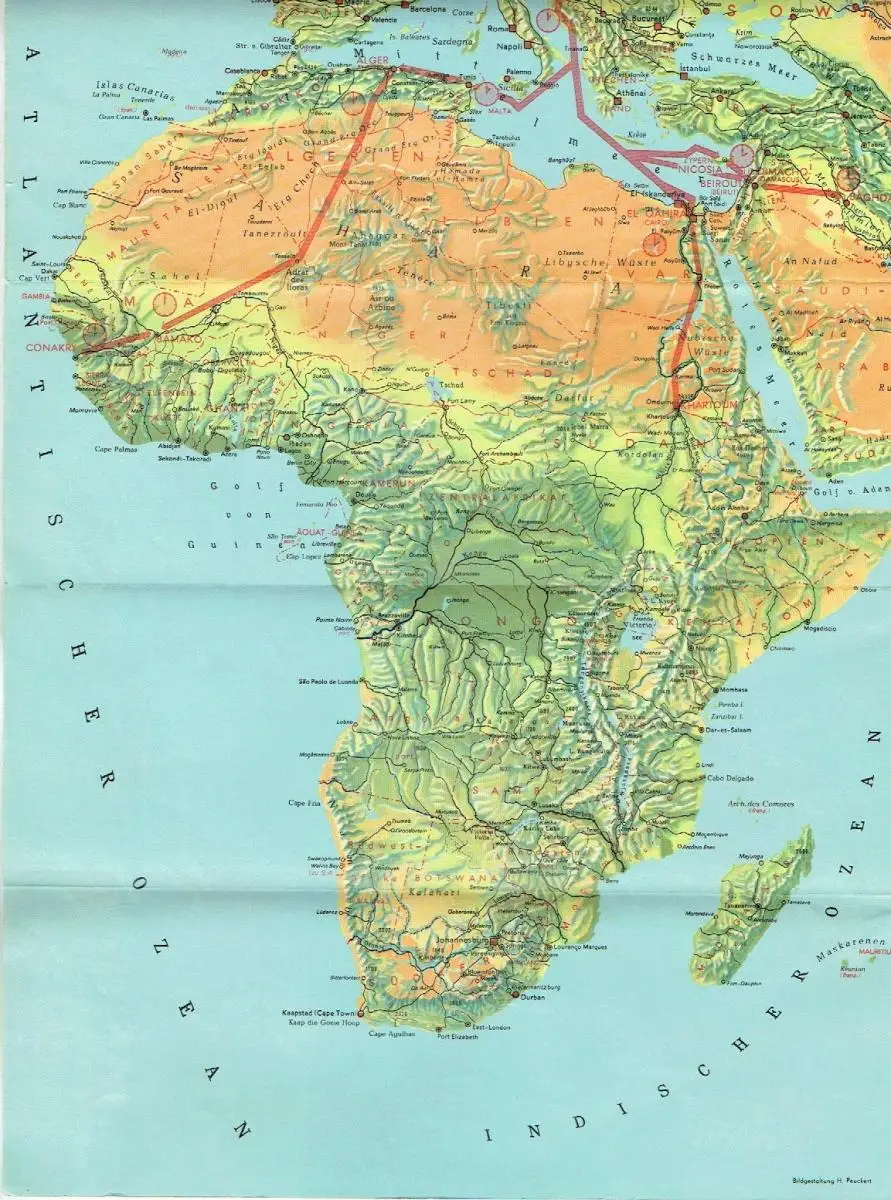 sehr guter Zustand, geringe Gebrauchs- und Alterungsspuren: rechte Kanten mit minimalen Blessuren, Fluglinien der DDR-Airline: Europa - Naher Osten - Afrika Falt-Prospekt: Atlas mit eingezeichneten Fluglinien in diese Regionen, Papier, ca. 29,5 x 10 (aufklappbar auf ca. 59 x 40), 16 Seiten