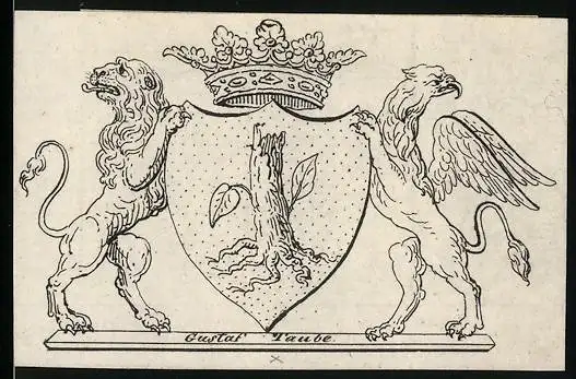 Exlibris Gustaf Taube, Wappen mit Krone von Greif & Löwe flankiert
