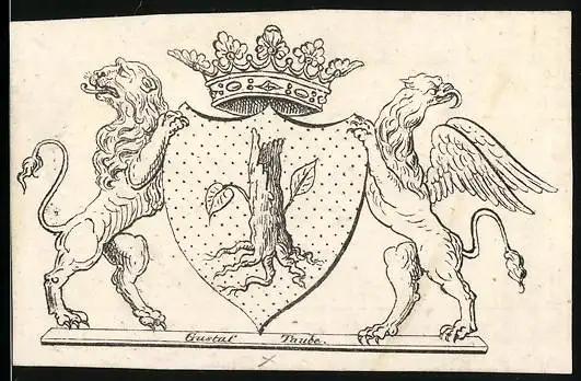 Exlibris Gustaf Taube, Wappen mit Krone von Greif & Löwe flankiert