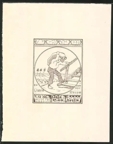 Exlibris Herman Mulder, Mann mit Sack auf Treppe
