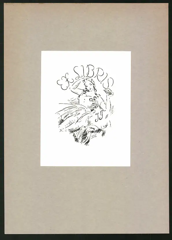 Exlibris J. J., junge Frau leicht bekleidet mit einem Buch in der Hand