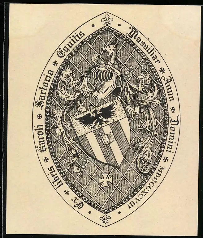 Exlibris Karoli Sartoria Equitis, Wappen mit Ritterhelm