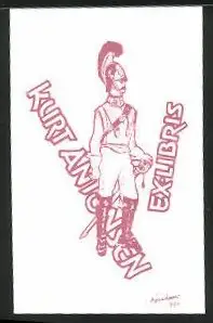 Exlibris Kurt Antonsen, Soldat in Uniform mit Crista-Helm und Schwert