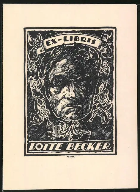 Exlibris Lotte Becker, Kopf umgeben von Engeln
