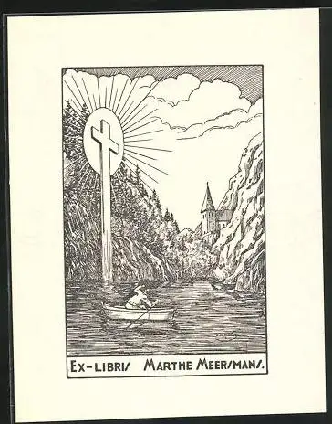 Exlibris Marthe Meersmans, Ruderbootfahrer erblickt Kreuz