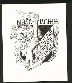 Exlibris Nase Kniha, Wappen mit Löwe und Fackel