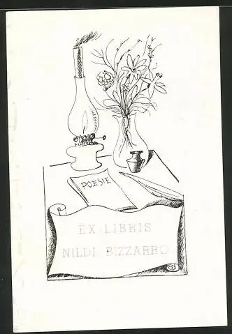 Exlibris Nilde Bizzarro, Öllampe, Blumen und Poesieheft