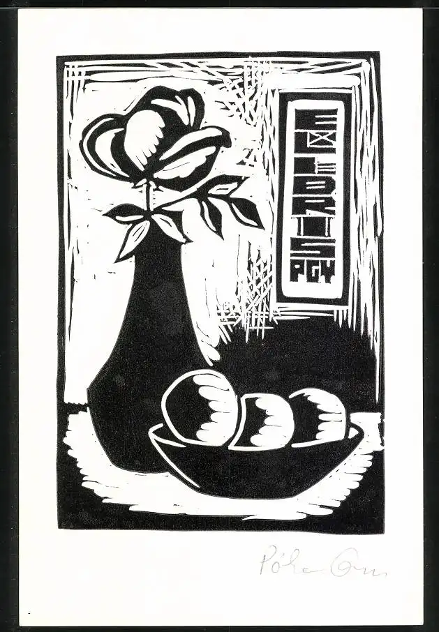 Exlibris PGY, Stillleben mit Obstschale und Blumenvase