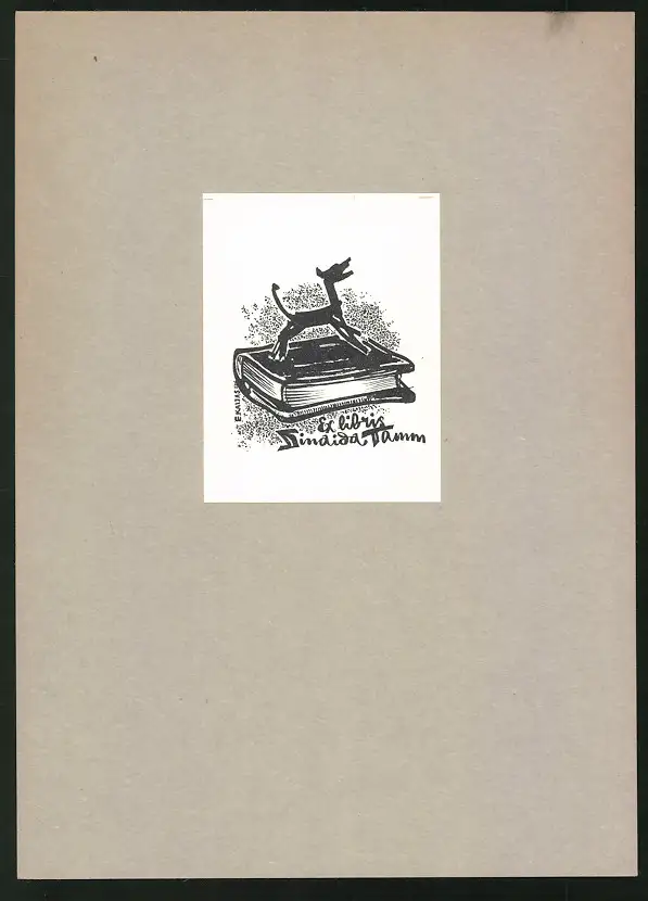 Exlibris Zindida Tamm, Hund springt auf einem Buch herum