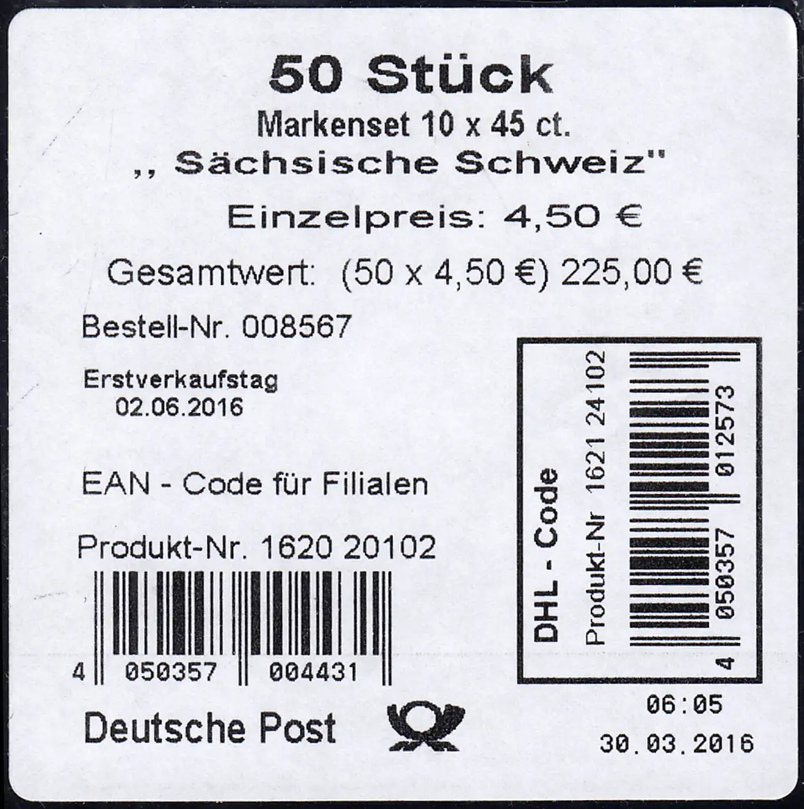 FB 59 Sächsische Schweiz, Folienblatt-BANDEROLE mit DHL-Code