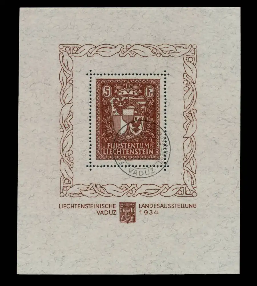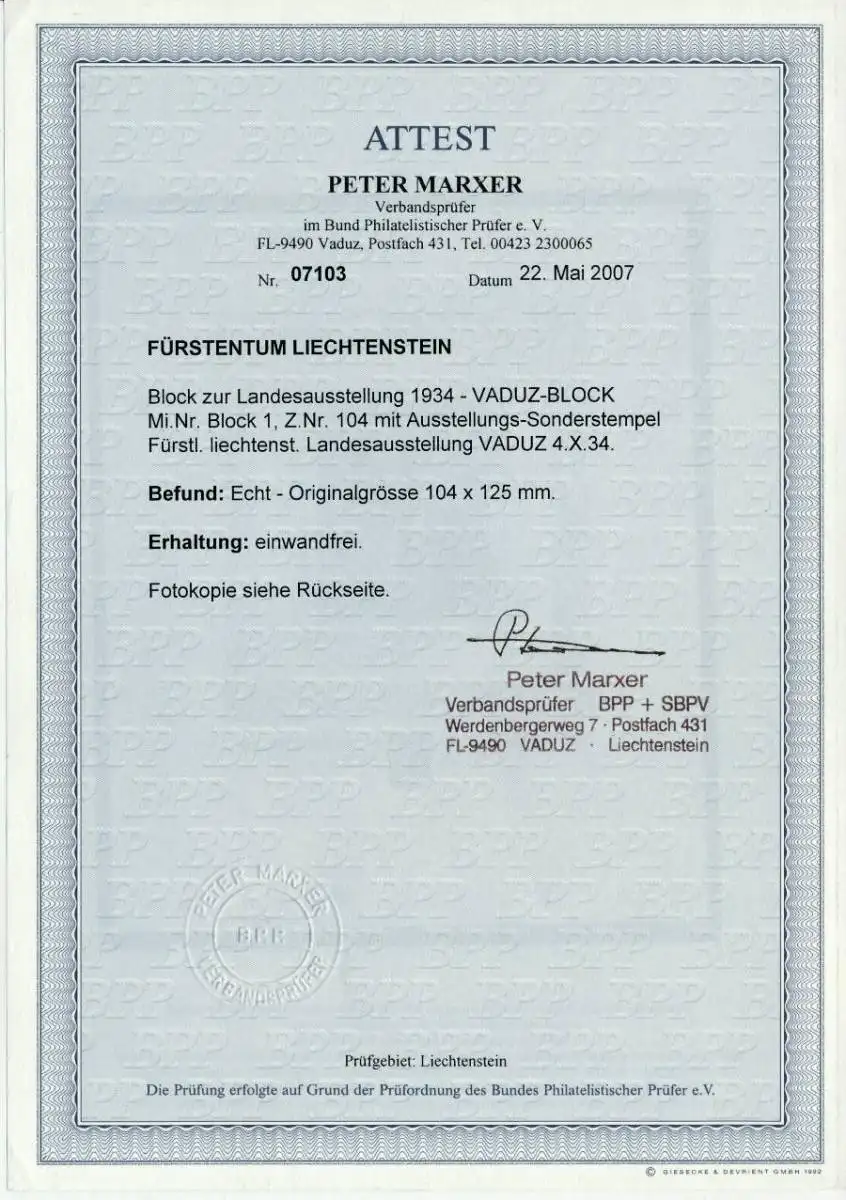 Block 1 Liechtensteinische Landesausstellung und 1. Liechtensteinische Briefmarkenausstellung in Vaduz, mit Fotoattest Marxer, einwandfrei!