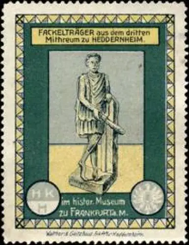 aus dem dritten Mithreum zu Heddernheim im historischen Museum zu Frankfurt am Main, Größe/Zustand: 6x4 , guter Zustand, Original alte Reklamemarke die seinerzeit für die Werbung benutzt wurde
