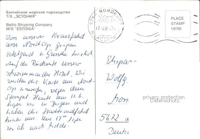 Faehre M/S Estonia Schiffe postalisch gelaufen nach 1965 Erhaltung siehe scans Alte Ansichtskarte Postkarte PaolPID1
