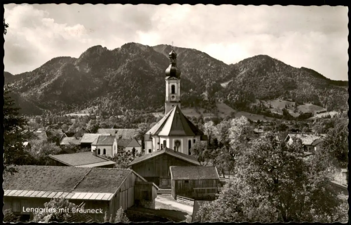 Fall-Lenggries Lenggries mit Brauneck Panorama Blick zur Kirche 1955