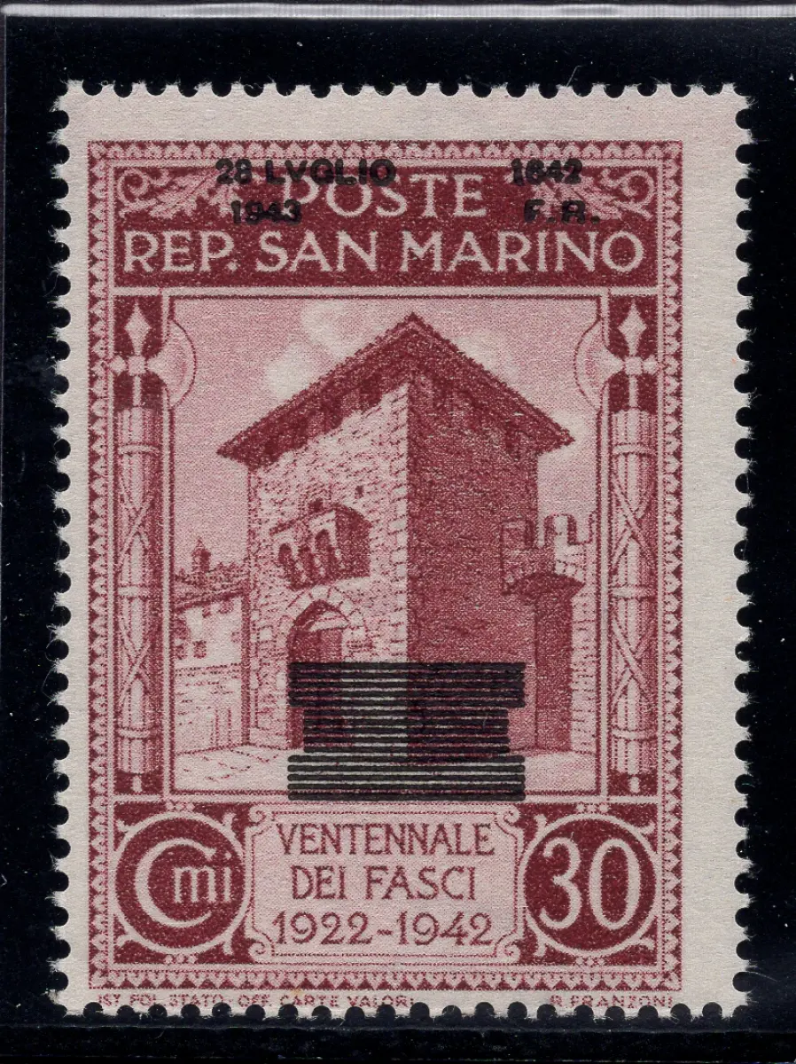 MNH - Vollgummi - Fall des Faschismus Cent. 30 n. 257e Aufdruck stark nach oben verschoben, so dass der Schriftzug Venetennale dei Fasci vollständig sichtbar ist, neuer perfekter Vollgummi - Kat. euro 130 Cod. 3113/WEB