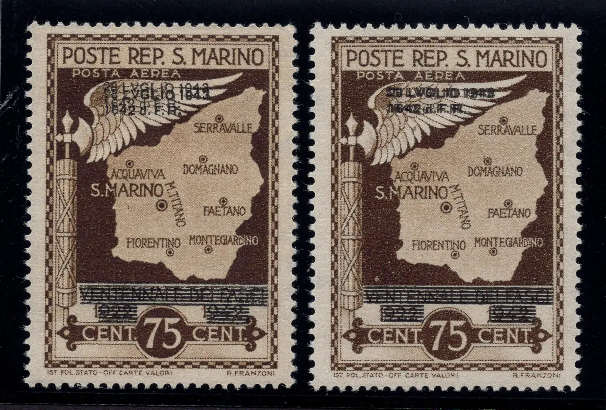 MNH - Vollgummi - Fall des Faschismus Luftpost Cent. 75 Nr. A36a zwei verschiedene Exemplare mit Doppelaufdruck, neuer perfekter Vollgummi - Kat. euro 130 Cod. 3119/WEB