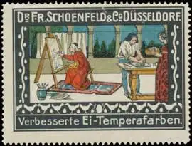 verbesserte Ei-Temperafarben, Größe/Zustand: 4x6 , beschädigt, Original alte Reklamemarke die seinerzeit für die Werbung benutzt wurde